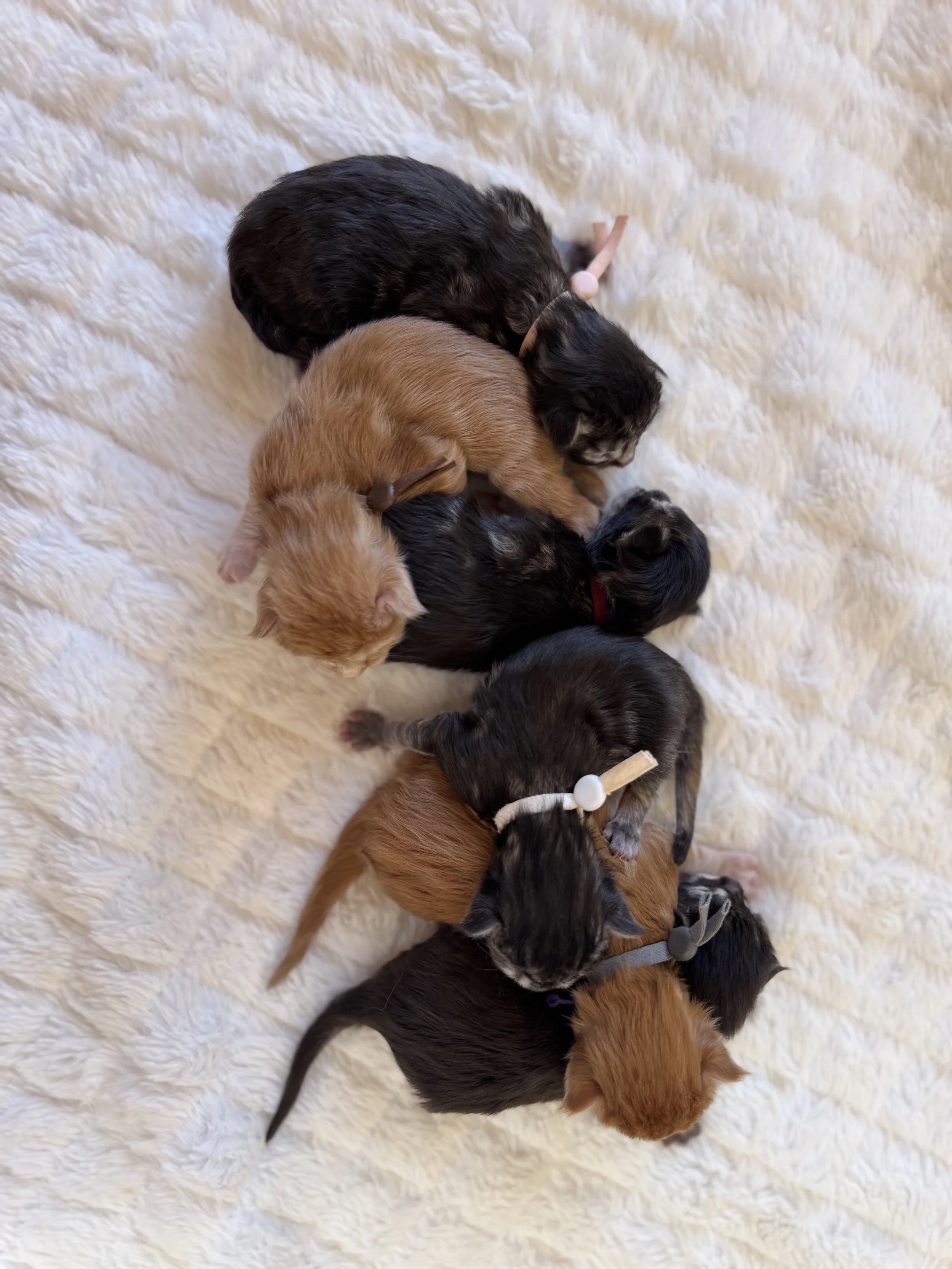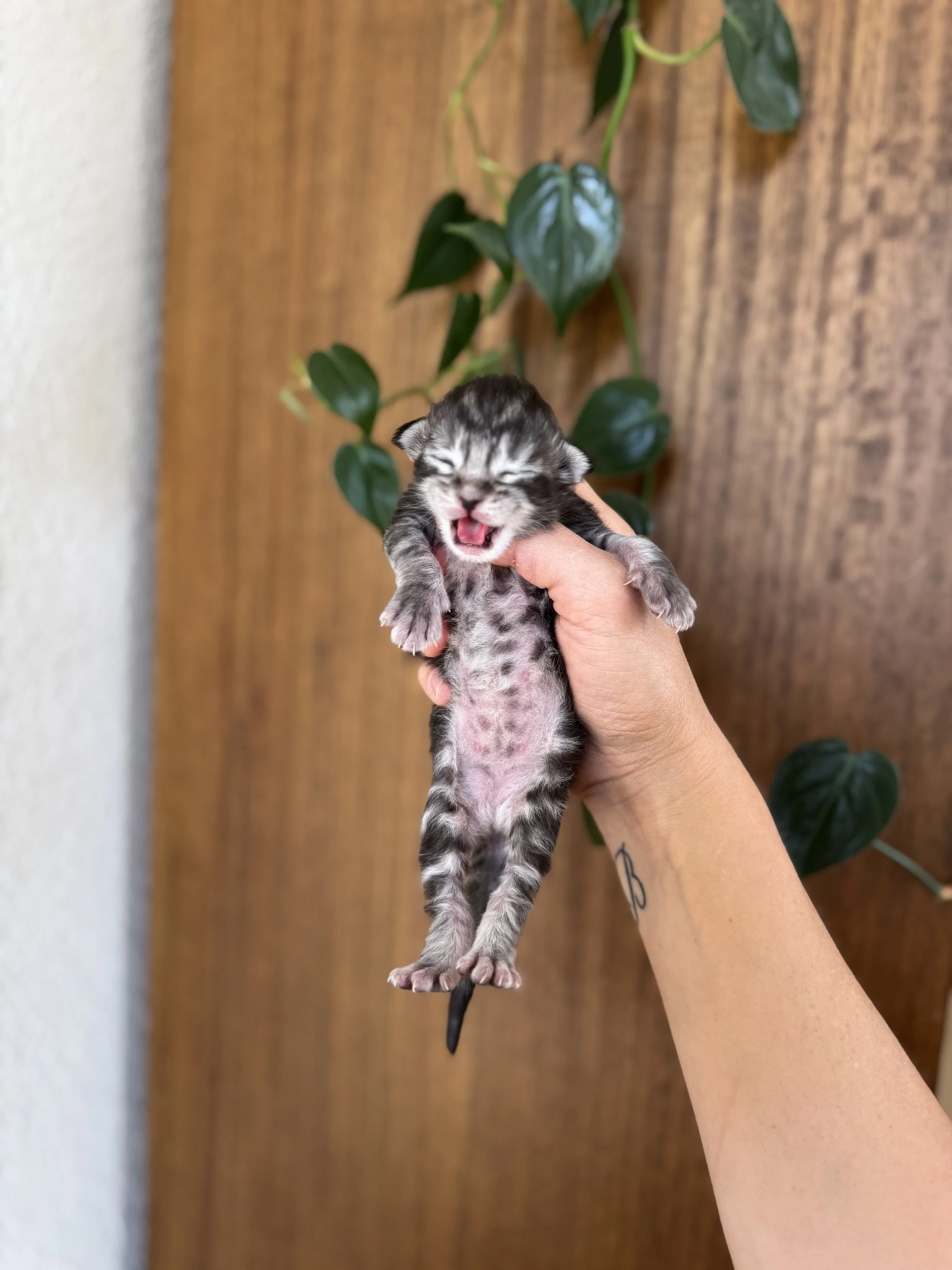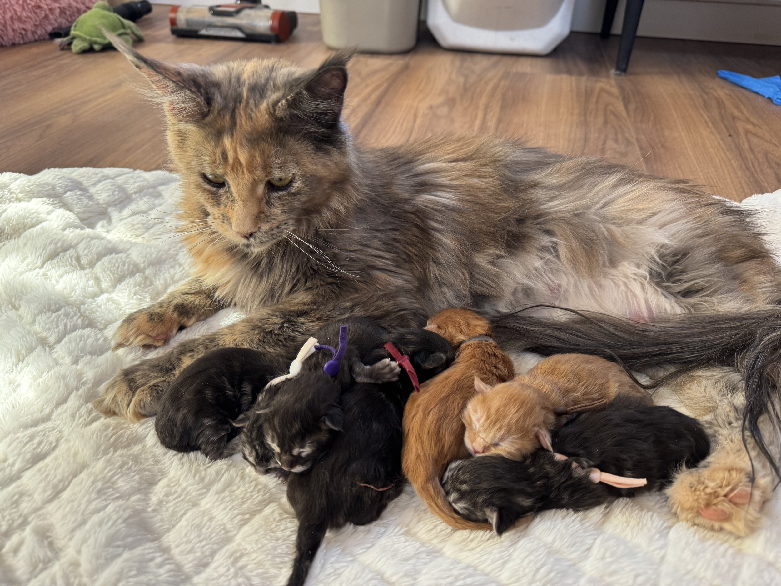 We’re so excited to introduce our brand-new litter, born to Aura, who is rocking her role as a first-time mom! Tide and Aura blessed us with six kittens- a perfect blend of 3 girls and 3 boys.