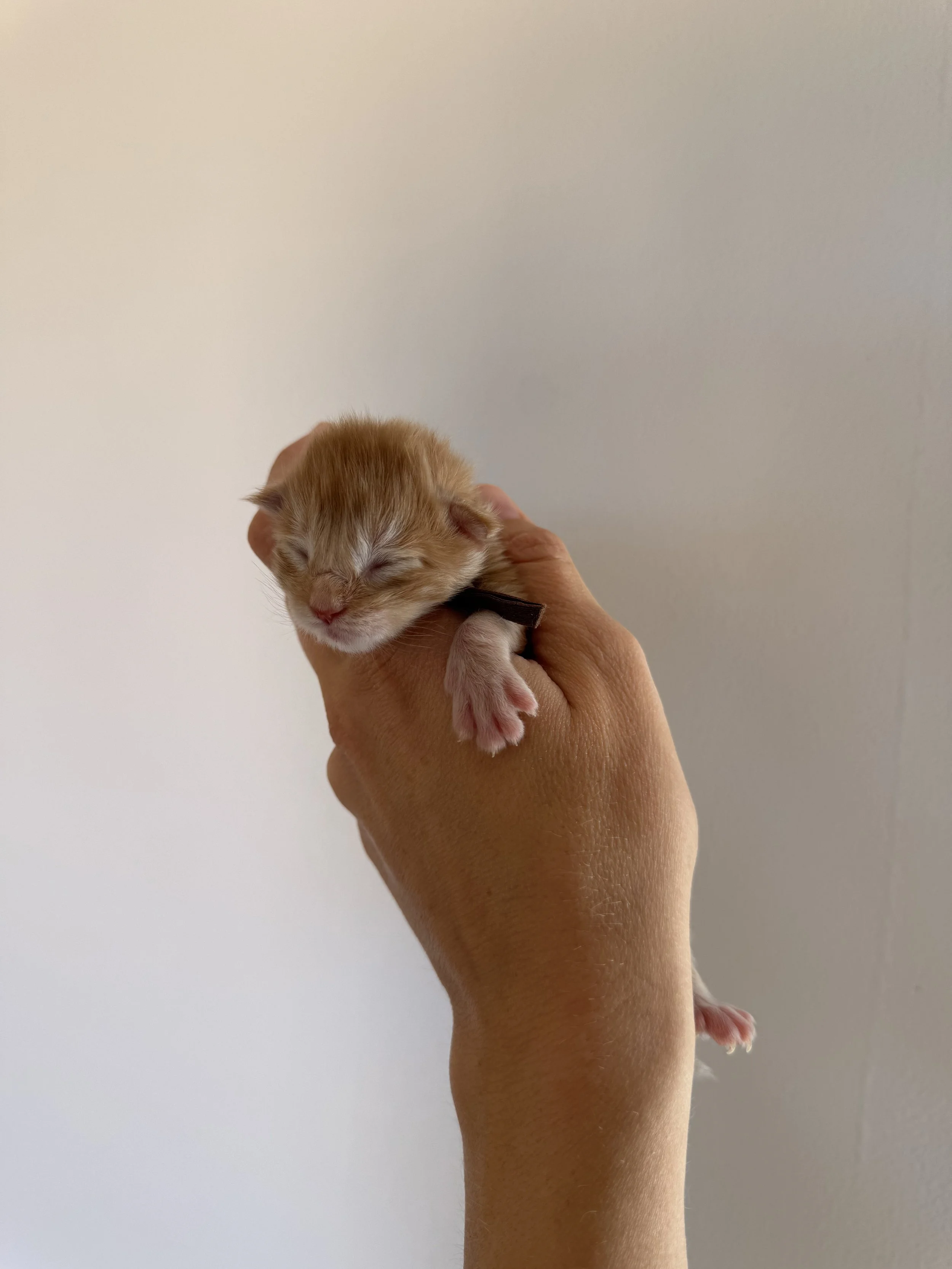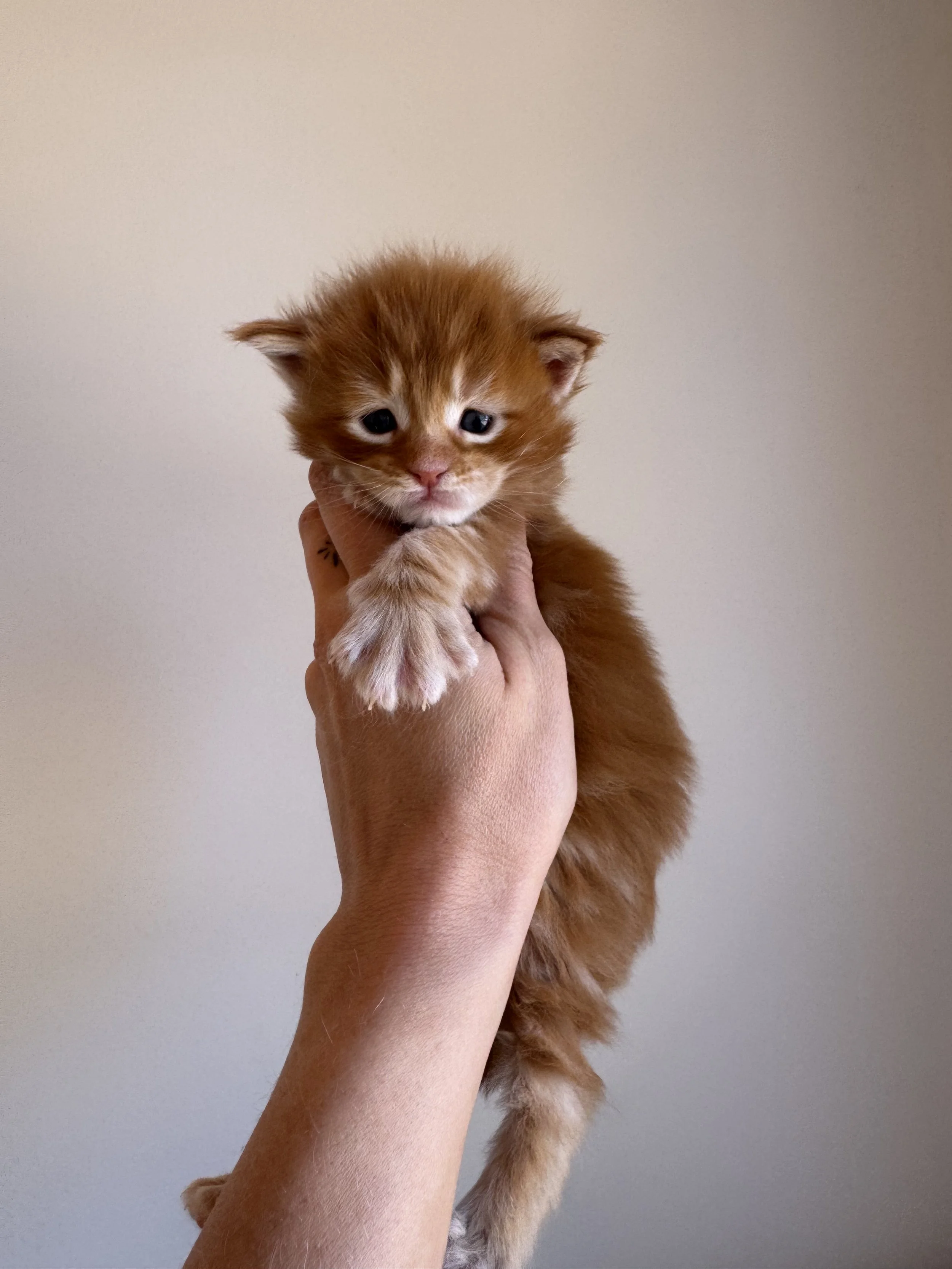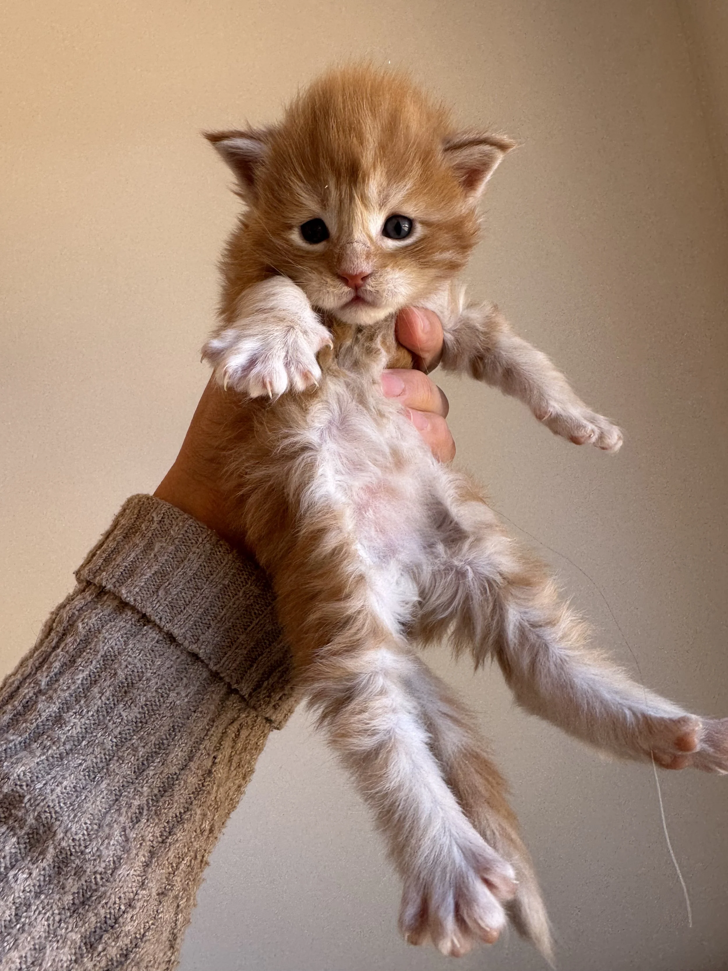 This handsome boy stands out from his sisters in the sweetest way. While they’re full of sass, he settles right down the moment I hold him, almost as if he’s already familiar with my scent. He’s the biggest of the bunch- a solid and healthy boy! His coat is a rich and vibrant red
