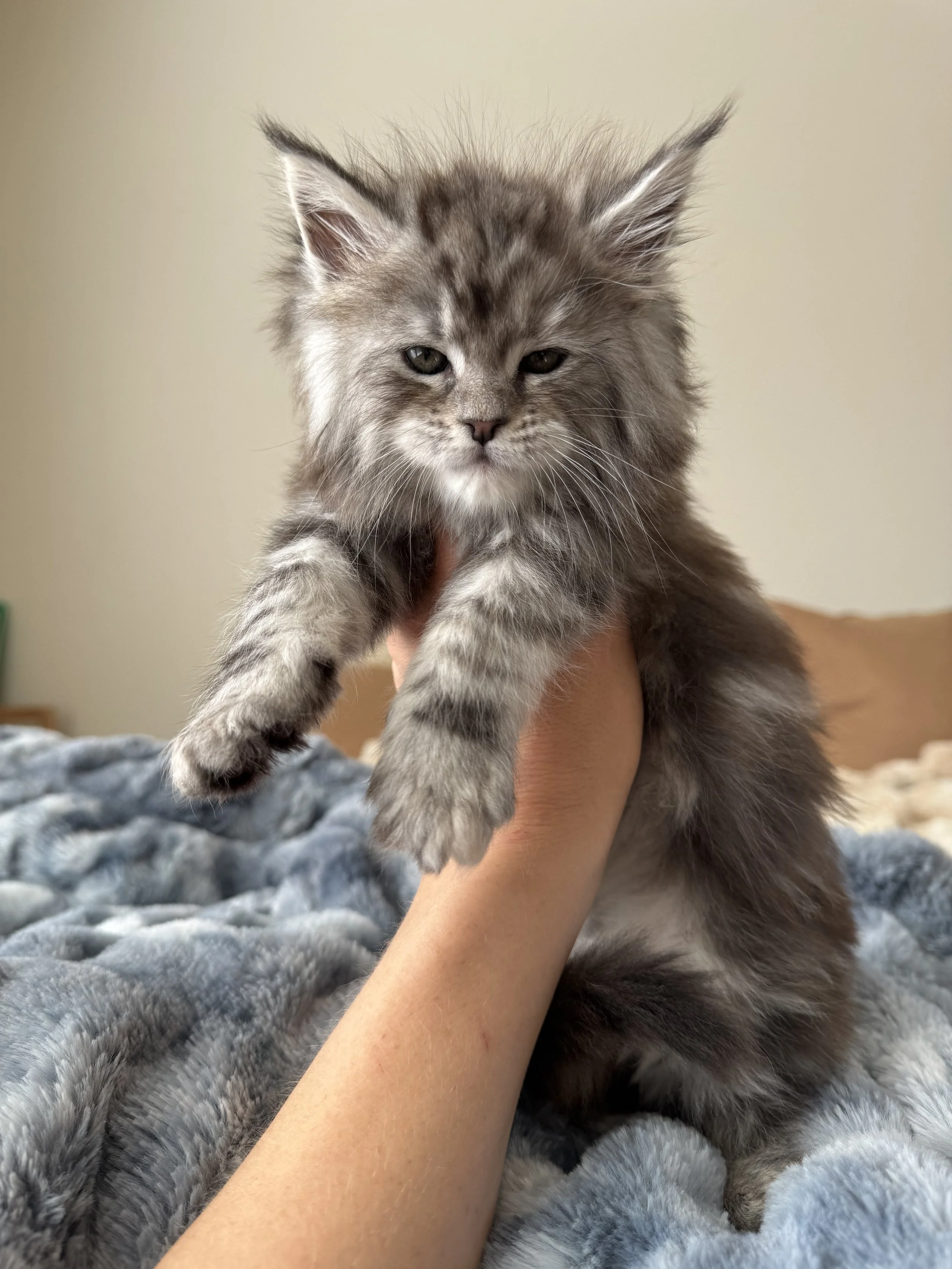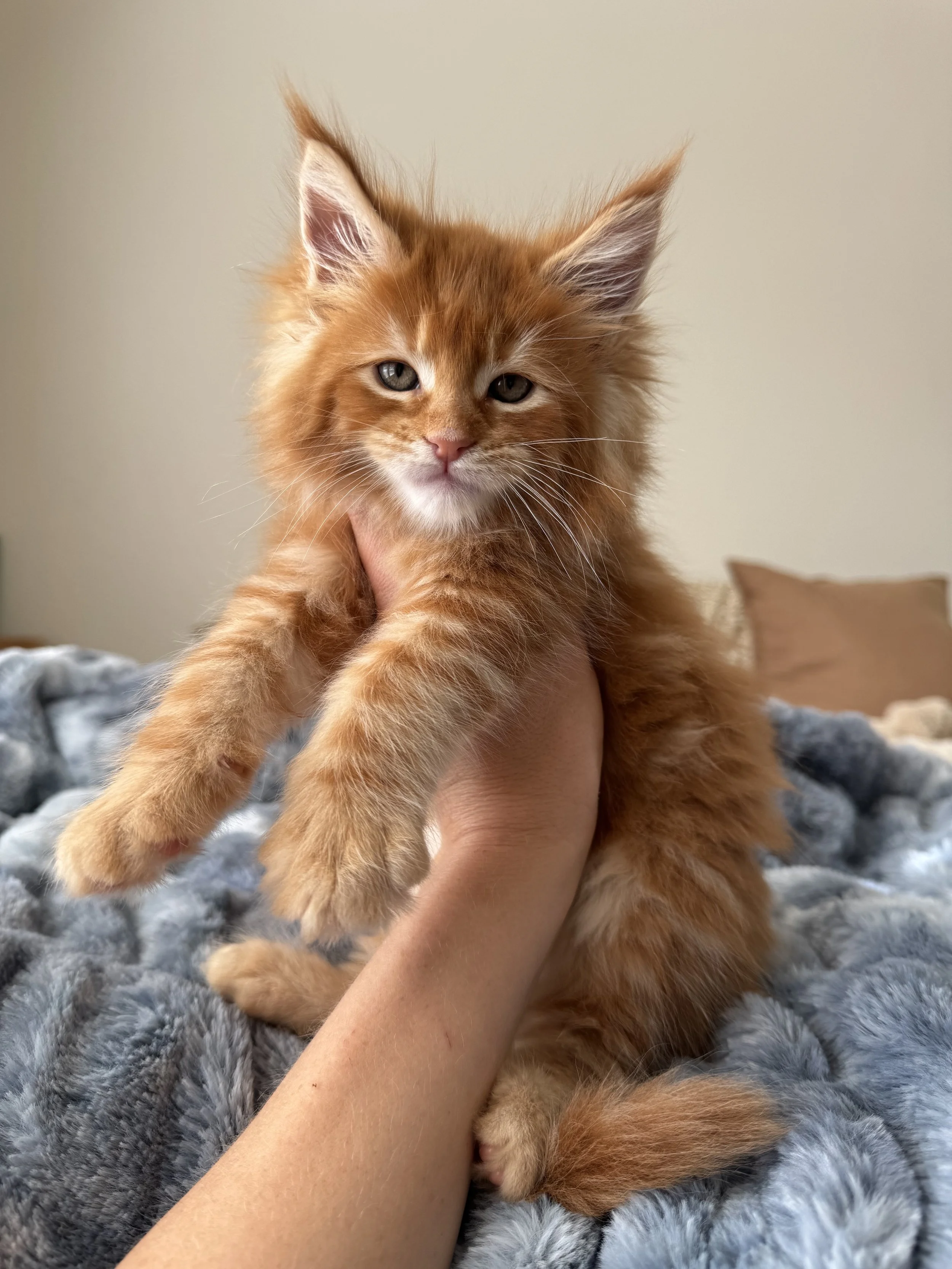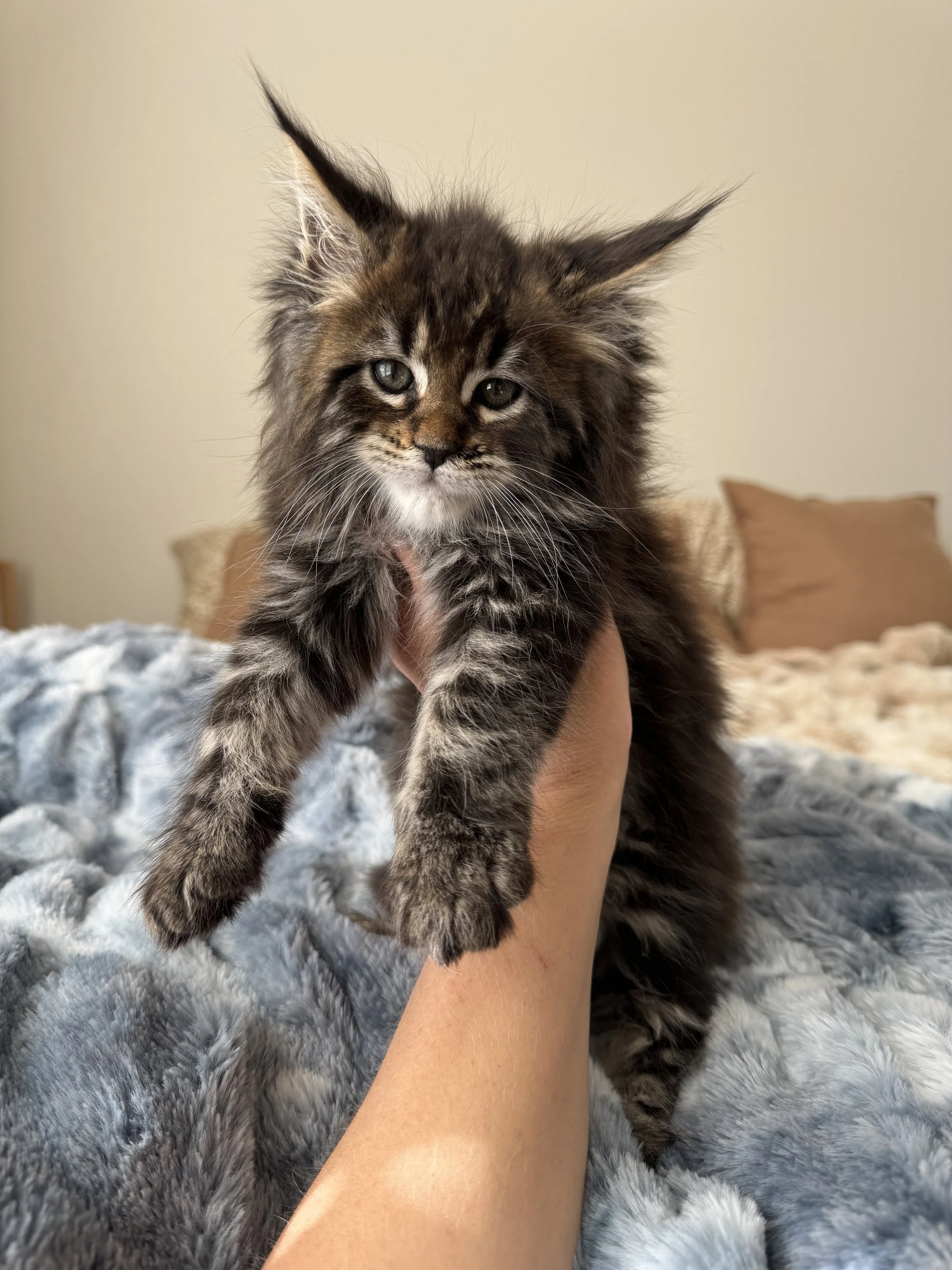 Born under the mystical Beaver Supermoon, Caelum carries a calm, otherworldly presence — his name means “heaven” in Latin. He was the biggest kitten ever born here at Southwest Maine Coons — a strong and beautifully built boy.